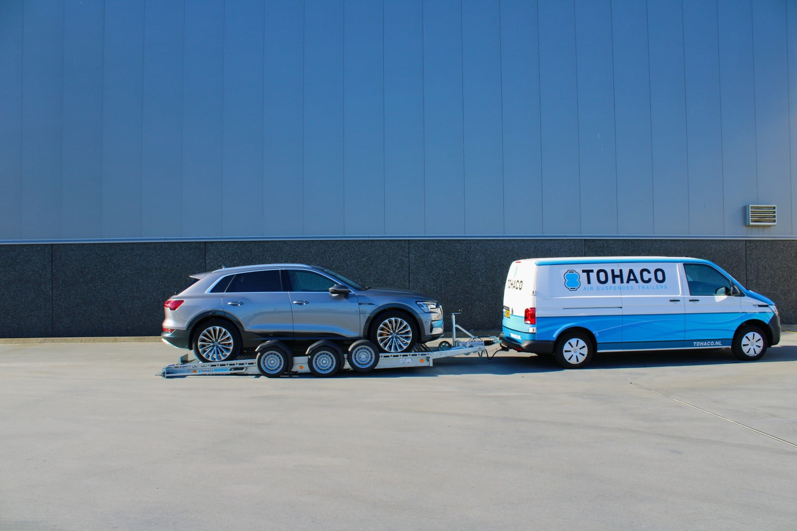 De Tohaco autotransporter is leverbaar als enkelas of dubbelas trailer. De maximale laadvloerbreedte van de autotransporter bedraagt 200cm! Oprijplaten zijn niet meer nodig, want met de luchtvering laat u de laadvloer eenvoudig op de straat zakken. Daardoor veel veiliger op en af rijden en het gerammel van oprijplaten onderweg is verleden tijd. En wat te denken van geen fysieke belasting meer door het werken met oprijplaten.